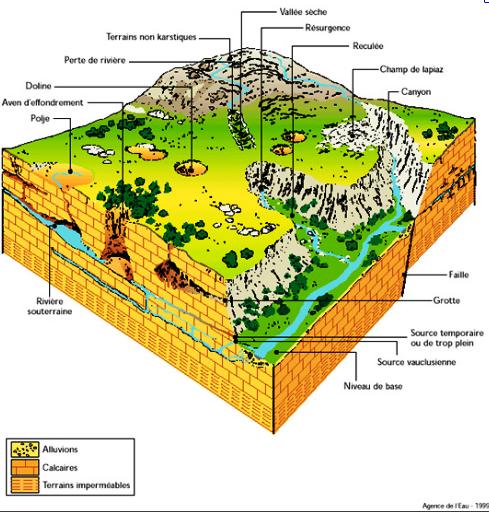 Dans les plateaux calcaires jurassiens, les eaux s’infiltrent dans le sous-sol, agrandissent les fissures, creusent des grottes ... et réapparaissent plus loin (jusqu'à plusieurs kilomètres ) lorsqu'elles émergent, à l’air libre sous forme de résurgences. Ces formations liées aux calcaires poreux s'appellent le karst.
